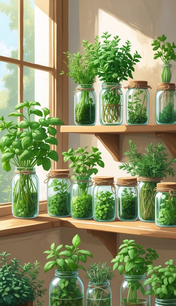 This setup keeps herbs healthy and mess-free. I love having fresh herbs handy for cooking, and the jars look simple and stylish on the shelf.